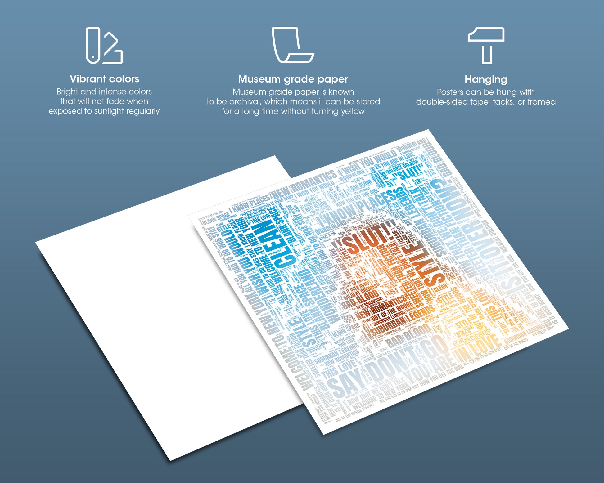 High-quality posters are made on premium matte paper. The design gets printed on white photo paper that yields brilliant prints to brighten up any room. Please note that this product is somewhat delicate, not scuff-resistant or waterproof.