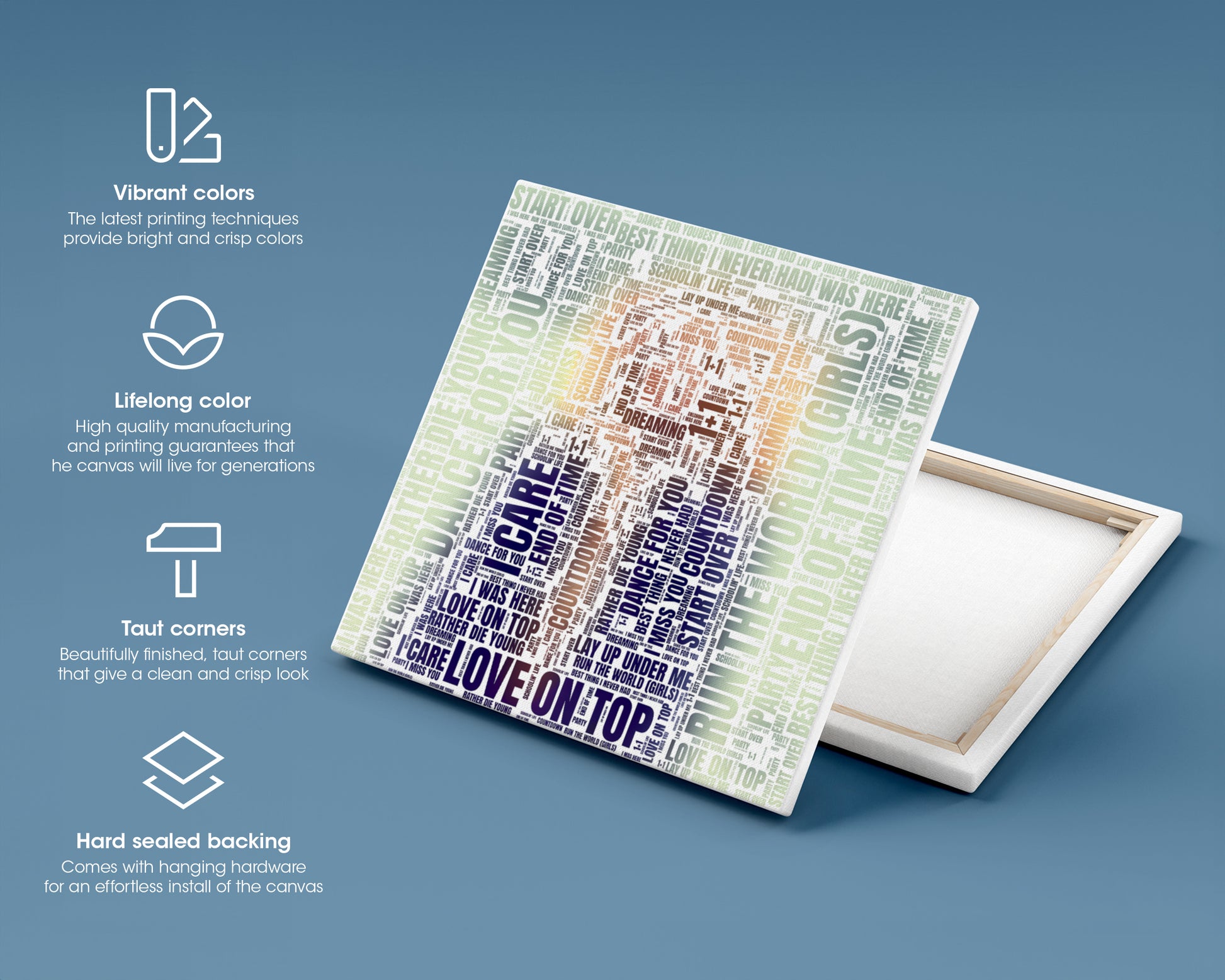 Transform your wall into a stunning work of art. This gorgeous word art design was inspired and created from your favorite album and its song titles. The minimal feel and vivid color make it stand out yet able to fit in with any style of decor. Your space should reflect who you are and what you care about. Adding a pop of color to your walls or desks is an easy way to inject some personality into any room and put a smile on your face. They also make a lovely gift for friends and family.