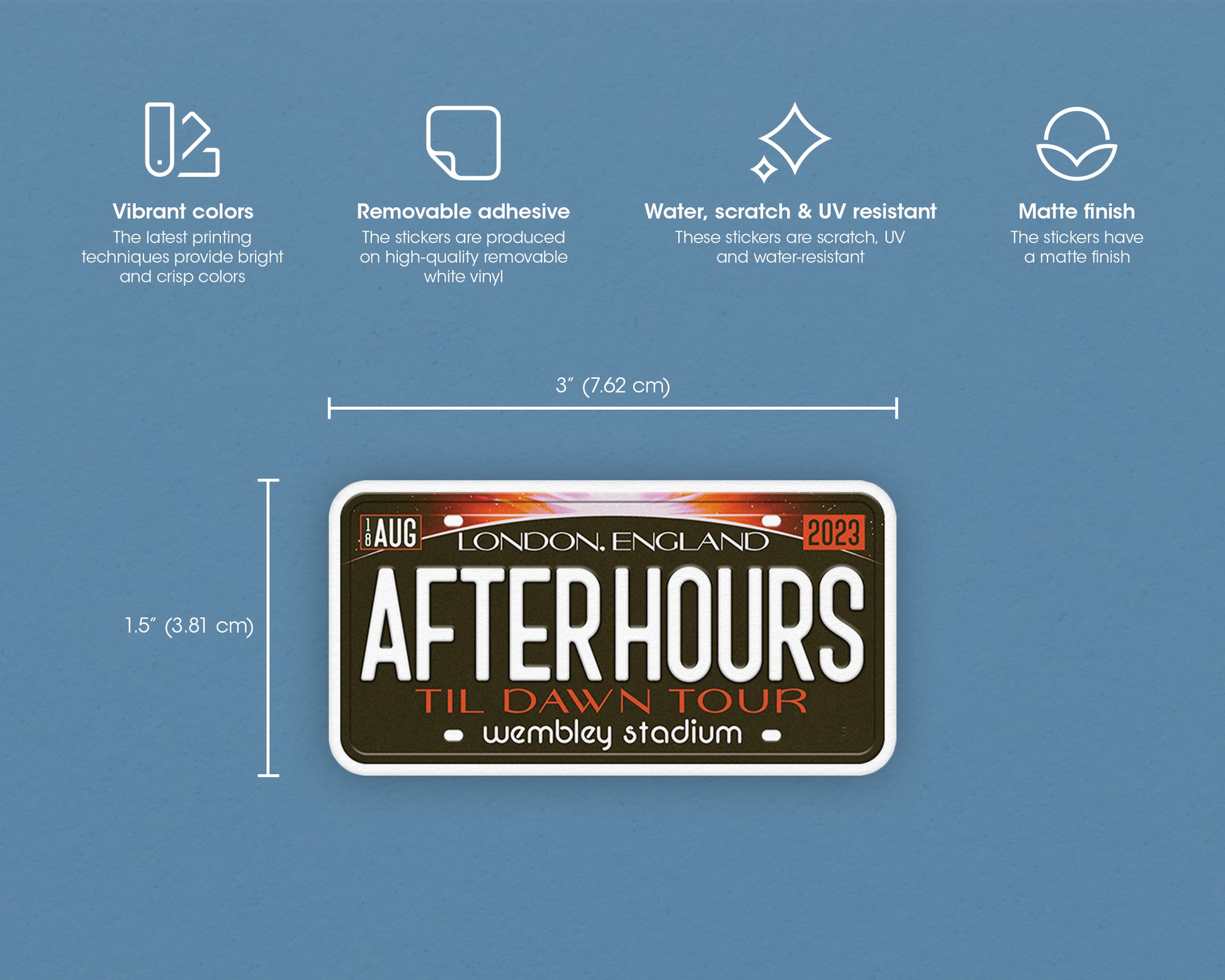 Your favorite tour inspired this cute personalized matte sticker. They’re made from a removable vinyl that makes them perfect to use on phone cases, laptops, journals, guitars, refrigerators, walls, computers, or whatever needs a dose of originality. Stickers are water-resistant so they also can be used on products that get wet occasionally such as drink bottles, bumpers, cars, helmets, skateboards, and windows. Your belongings should reflect who you are and what you care about. Adding a pop of color to them is an easy way to inject some personality and put a smile on your face. It also makes a lovely gift for friends and family.