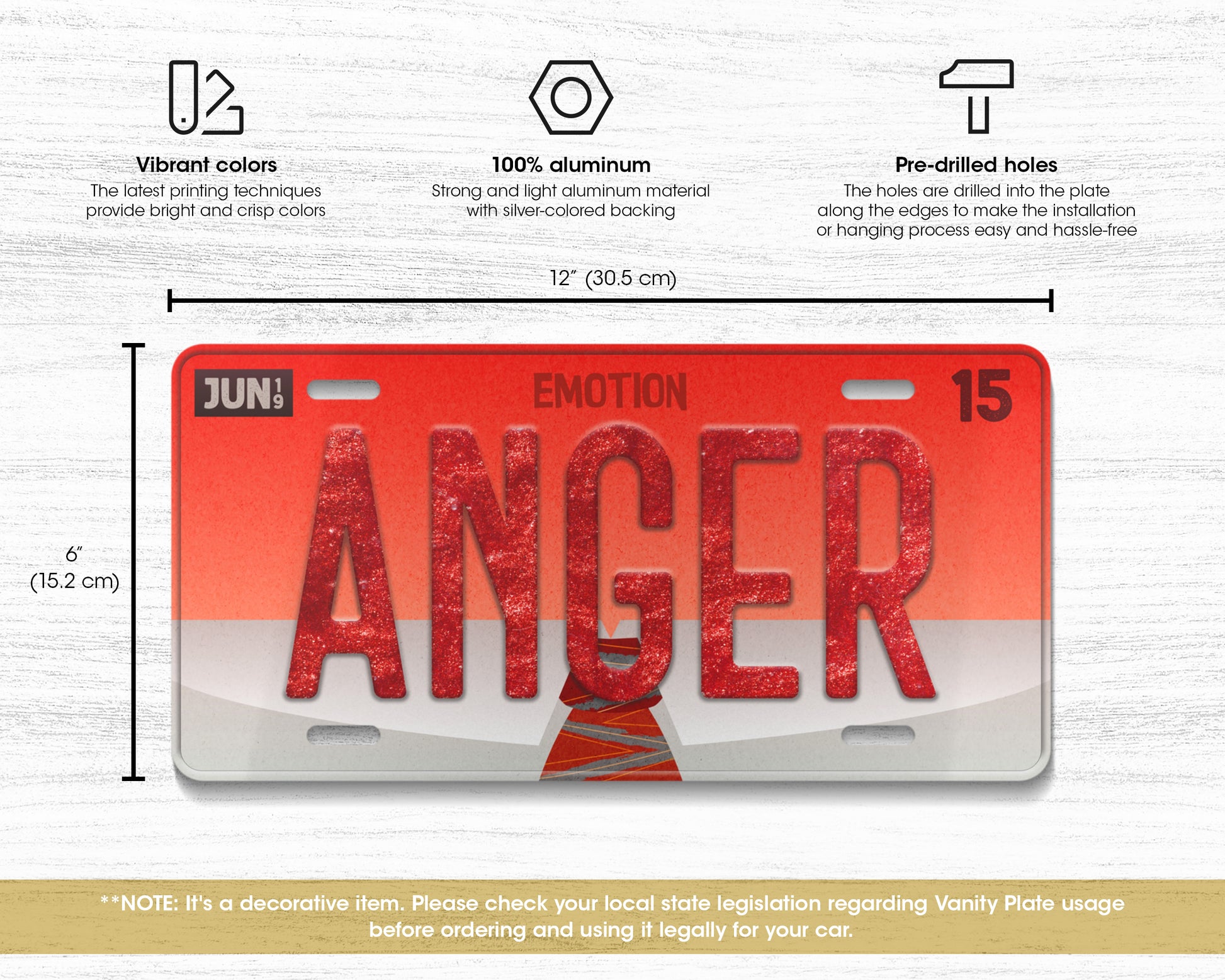 **NOTE: It's a decorative item. Please check your local state legislation regarding Vanity Plate usage before ordering and using it legally for your car.