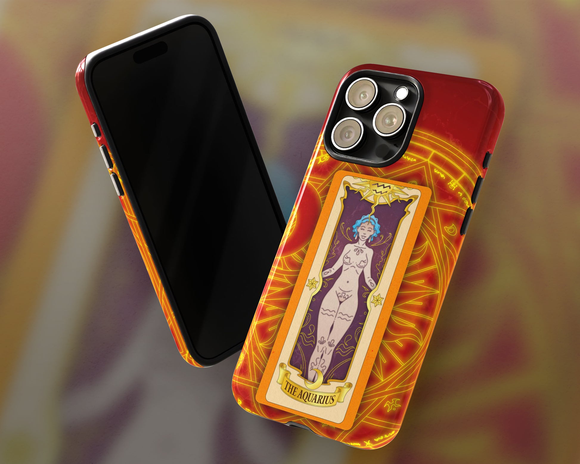 Discover the Aquarius zodiac sign character, illustrated in the enchanting Clow Card anime style. The character is featured on a golden glowing magic circle, set against a rich dark red background. This design captures Aquarius' innovative and independent spirit, merging astrological symbolism with a captivating, magical anime charm.