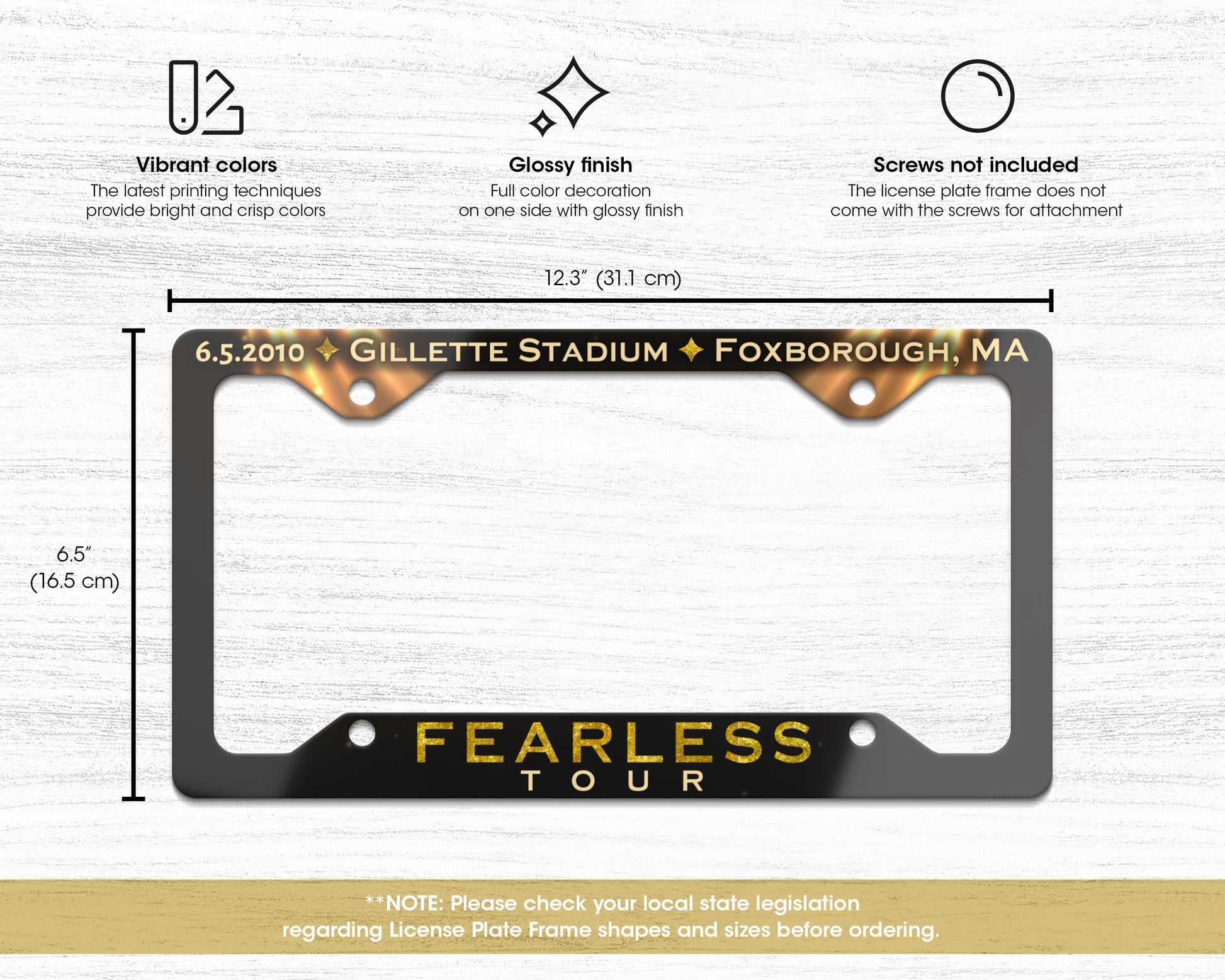 Choose your tour date, venue, city, state (or country), and get them printed on your license plate frame.