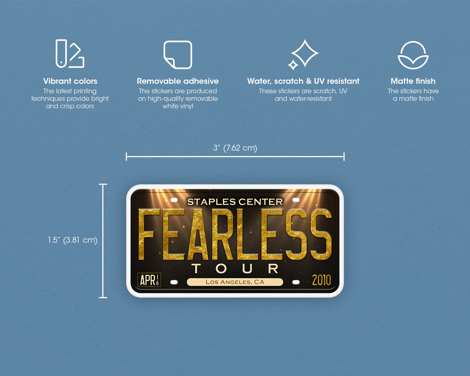 Your favorite tour inspired this cute personalized matte sticker. They’re made from a removable vinyl that makes them perfect to use on phone cases, laptops, journals, guitars, refrigerators, walls, computers, or whatever needs a dose of originality. Stickers are water-resistant so they also can be used on products that get wet occasionally such as drink bottles, bumpers, cars, helmets, skateboards, and windows. Your belongings should reflect who you are and what you care about. Adding a pop of color to them is an easy way to inject some personality and put a smile on your face. It also makes a lovely gift for friends and family.