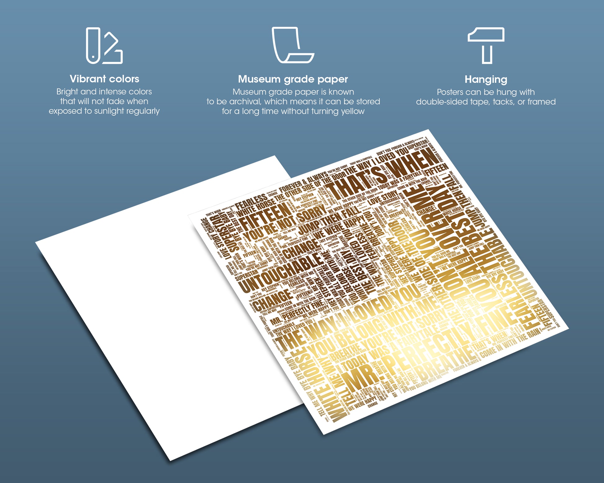 High-quality posters are made on premium matte paper. The design gets printed on white photo paper that yields brilliant prints to brighten up any room. Please note that this product is somewhat delicate, not scuff-resistant or waterproof.