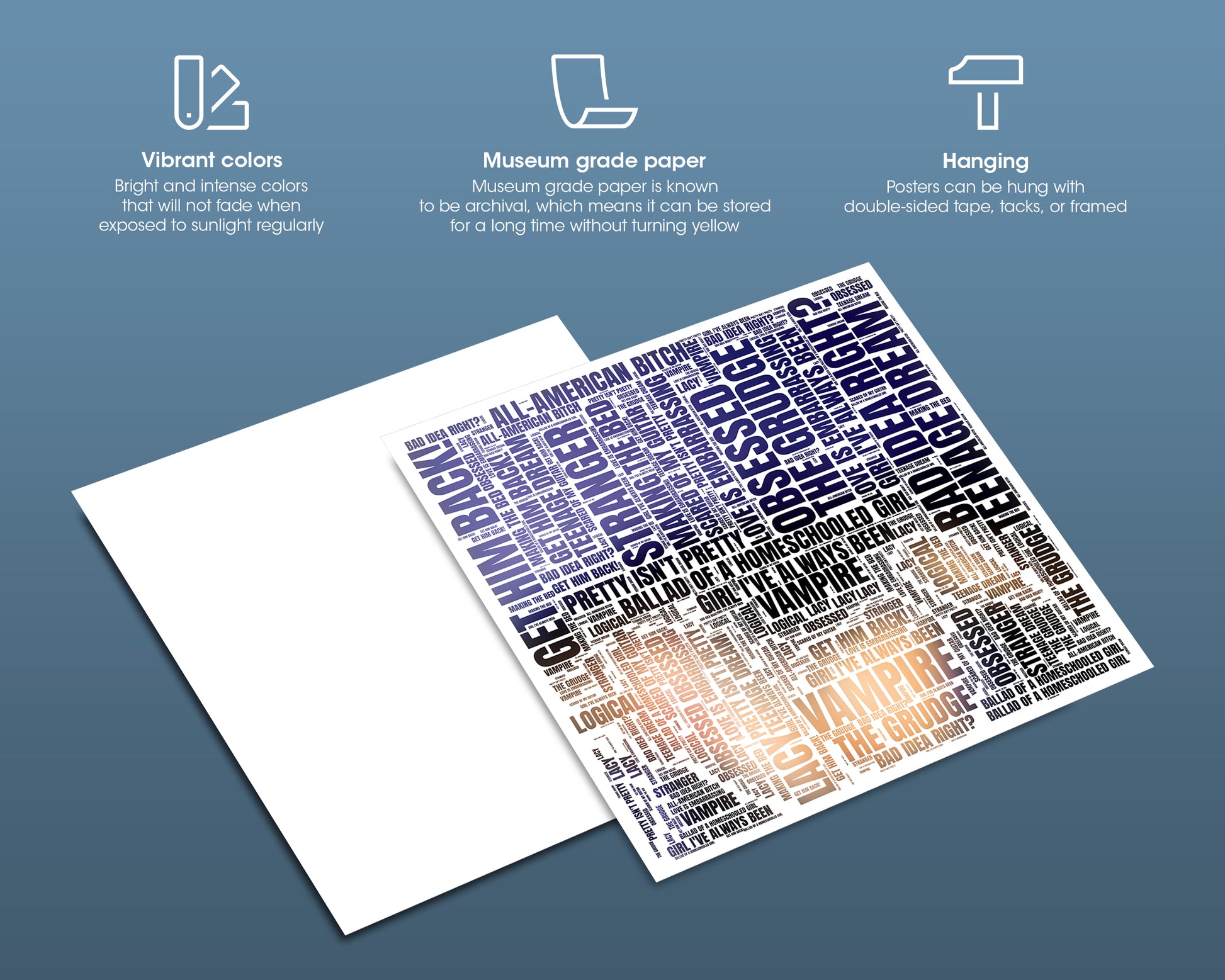 High-quality posters are made on premium matte paper. The design gets printed on white photo paper that yields brilliant prints to brighten up any room. Please note that this product is somewhat delicate, not scuff-resistant or waterproof.
