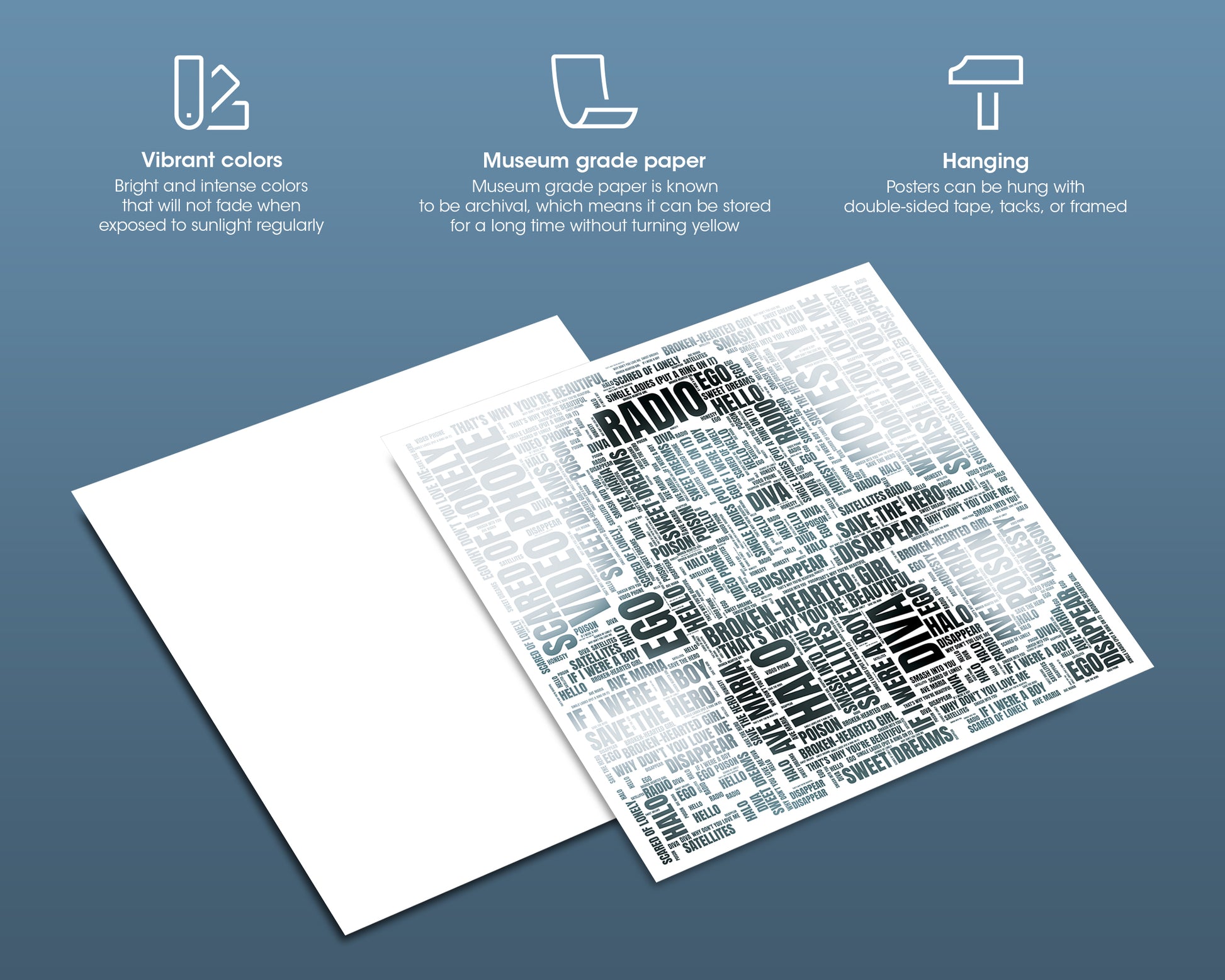 High-quality posters are made on premium matte paper. The design gets printed on white photo paper that yields brilliant prints to brighten up any room. Please note that this product is somewhat delicate, not scuff-resistant or waterproof.