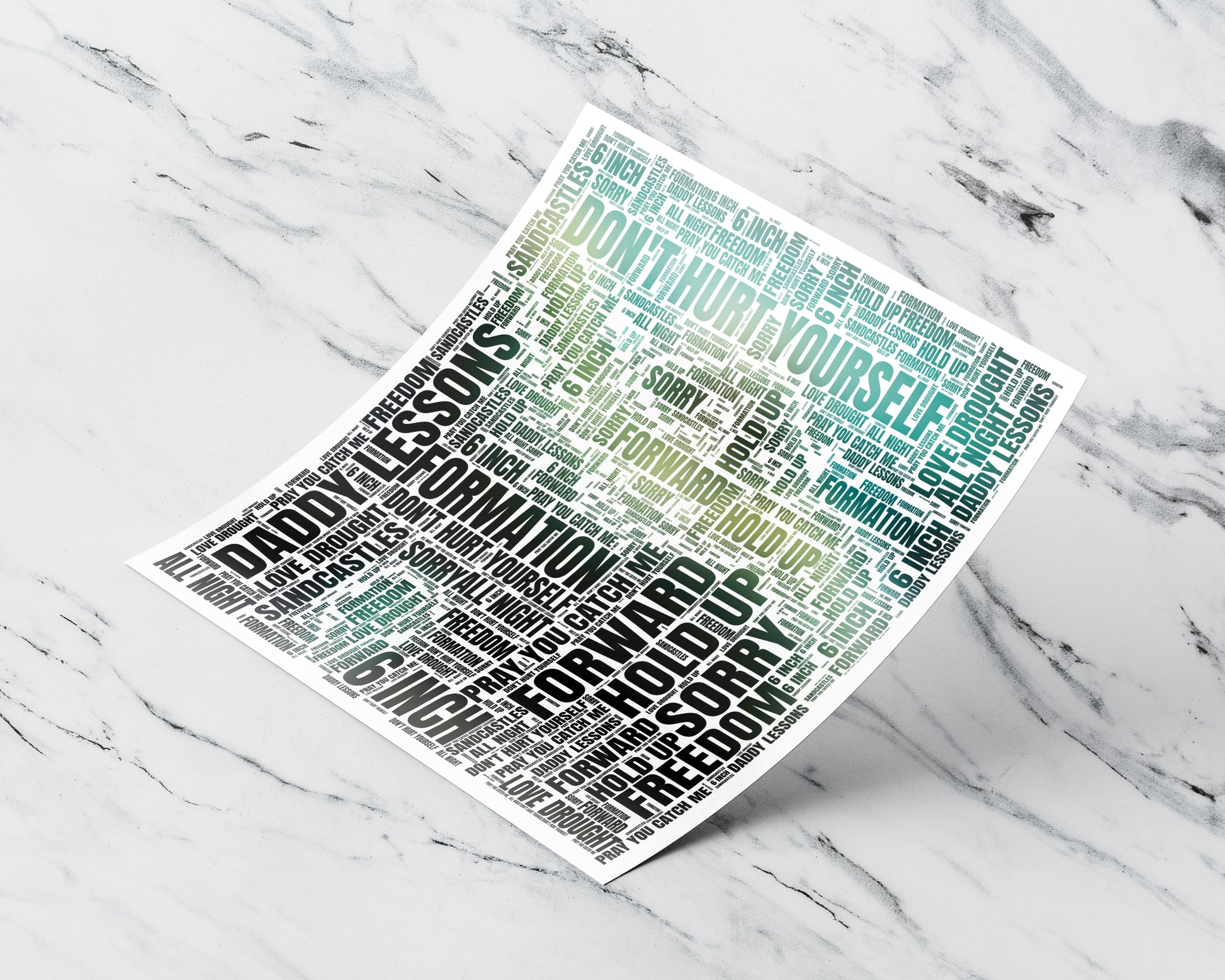 Transform your wall into a stunning work of art. This gorgeous word art design was inspired and created from your favorite album and its song titles. The minimal feel and vivid color make it stand out yet able to fit in with any style of decor. Your space should reflect who you are and what you care about. Adding a pop of color to your walls is an easy way to inject some personality into any room and put a smile on your face. They also make a lovely gift for friends and family.