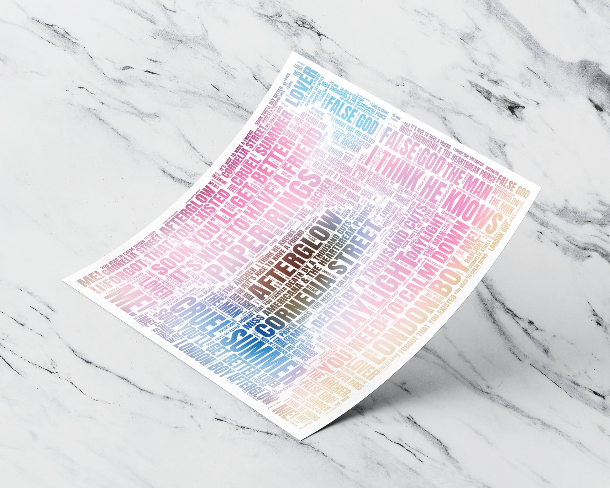 Transform your wall into a stunning work of art. This gorgeous word art design was inspired and created from your favorite album and its song titles. The minimal feel and vivid color make it stand out yet able to fit in with any style of decor. Your space should reflect who you are and what you care about. Adding a pop of color to your walls is an easy way to inject some personality into any room and put a smile on your face. They also make a lovely gift for friends and family.