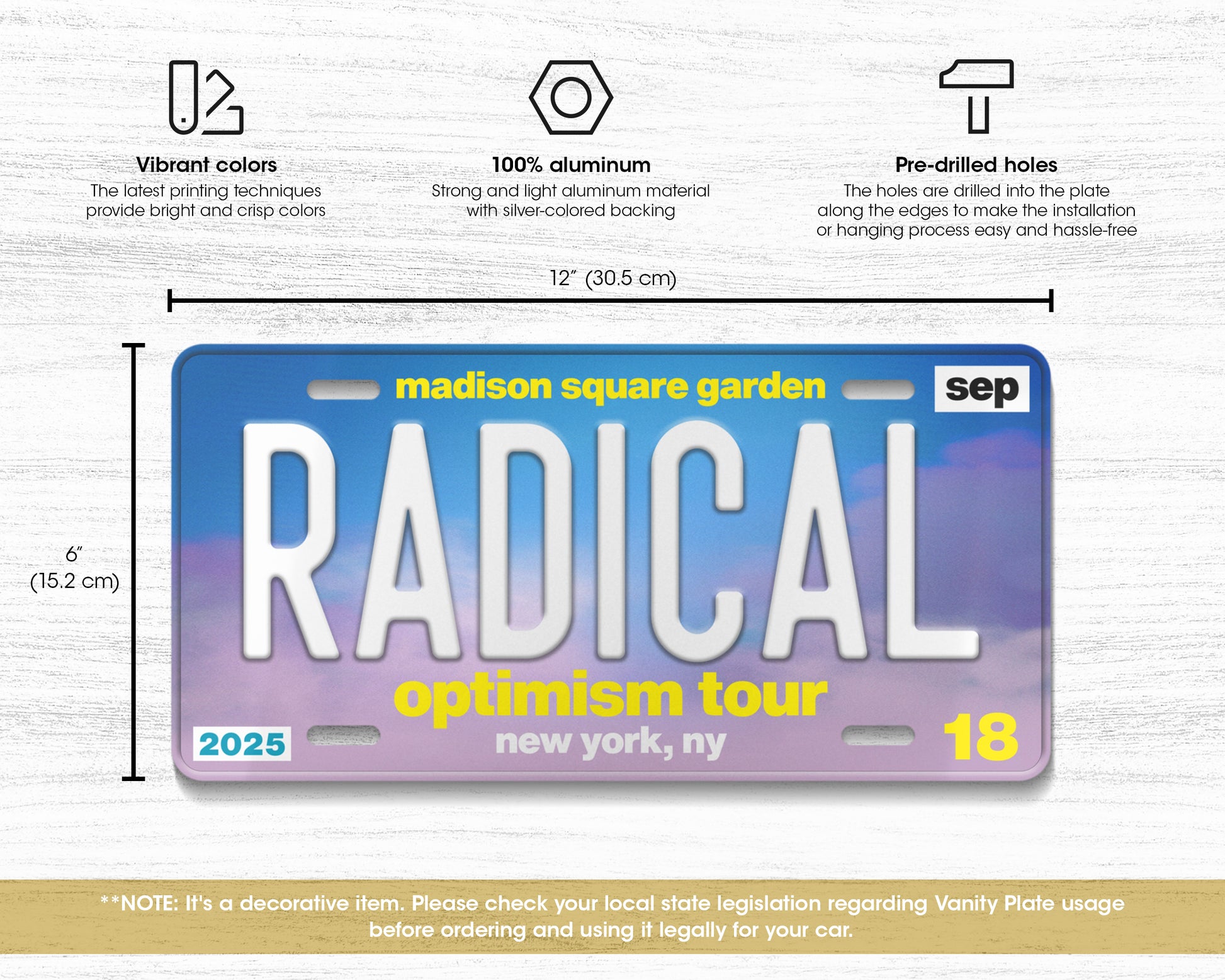 This gorgeous personalized license plate was inspired by your favorite tour. Measuring 12" x 6" (30.5 × 15.2 cm), it is the perfect size to decorate your car or your house wall as a stylish piece. Your place should reflect who you are and what you care about. Adding a pop of color to your space is an easy way to inject some personality and put a smile on your face. It also makes a lovely gift for friends and family.