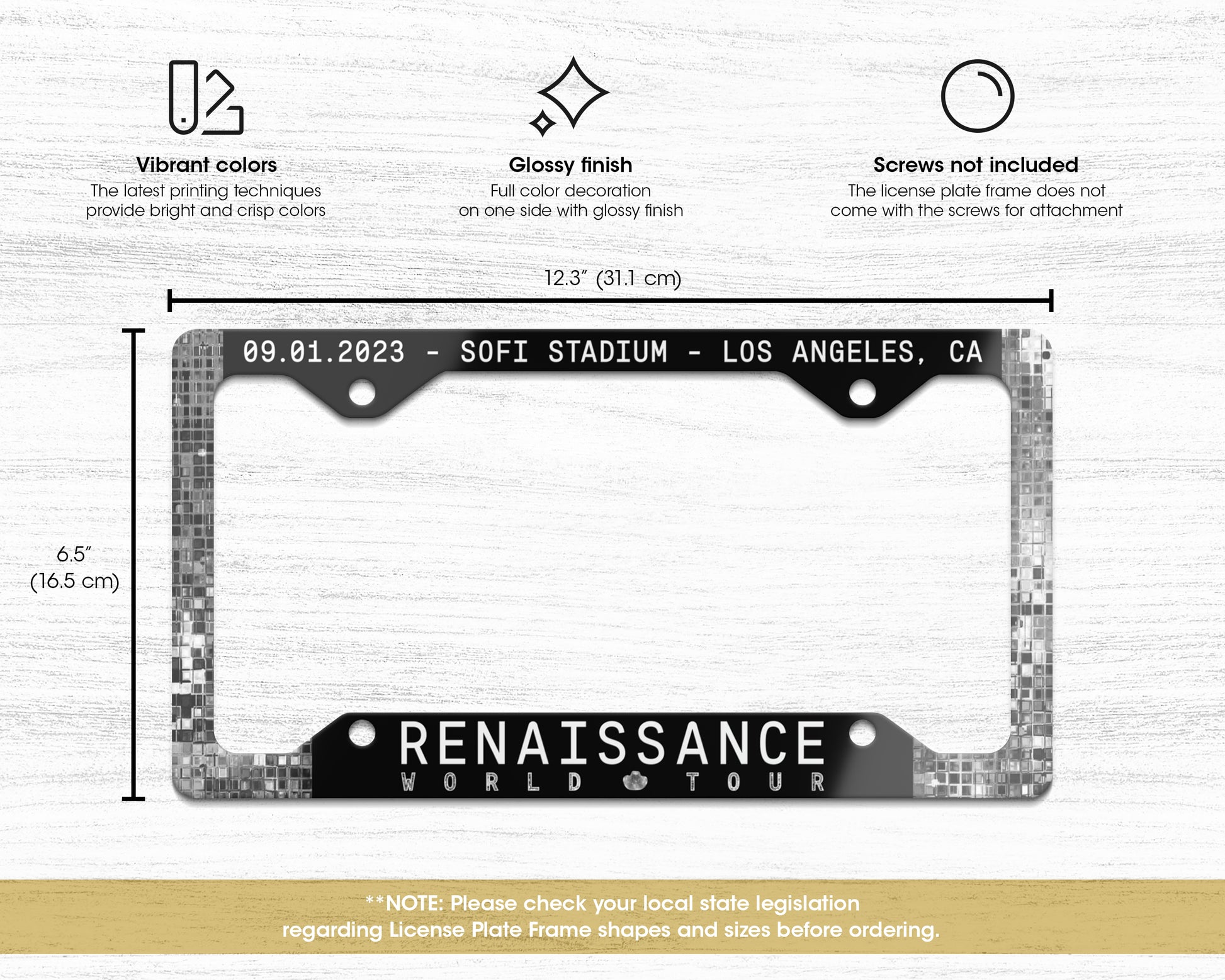 Let express yourself with this custom license plate frame which was inspired by your favorite tour. Measuring 12.3" x 6.5" (31.1cm x 16.5cm), it is the perfect size to decorate your license plate as a stylish piece. Your car should reflect who you are and what you care about. Adding a pop of color to it is an easy way to inject some personality and put a smile on your face. It also makes a lovely gift for friends and family.