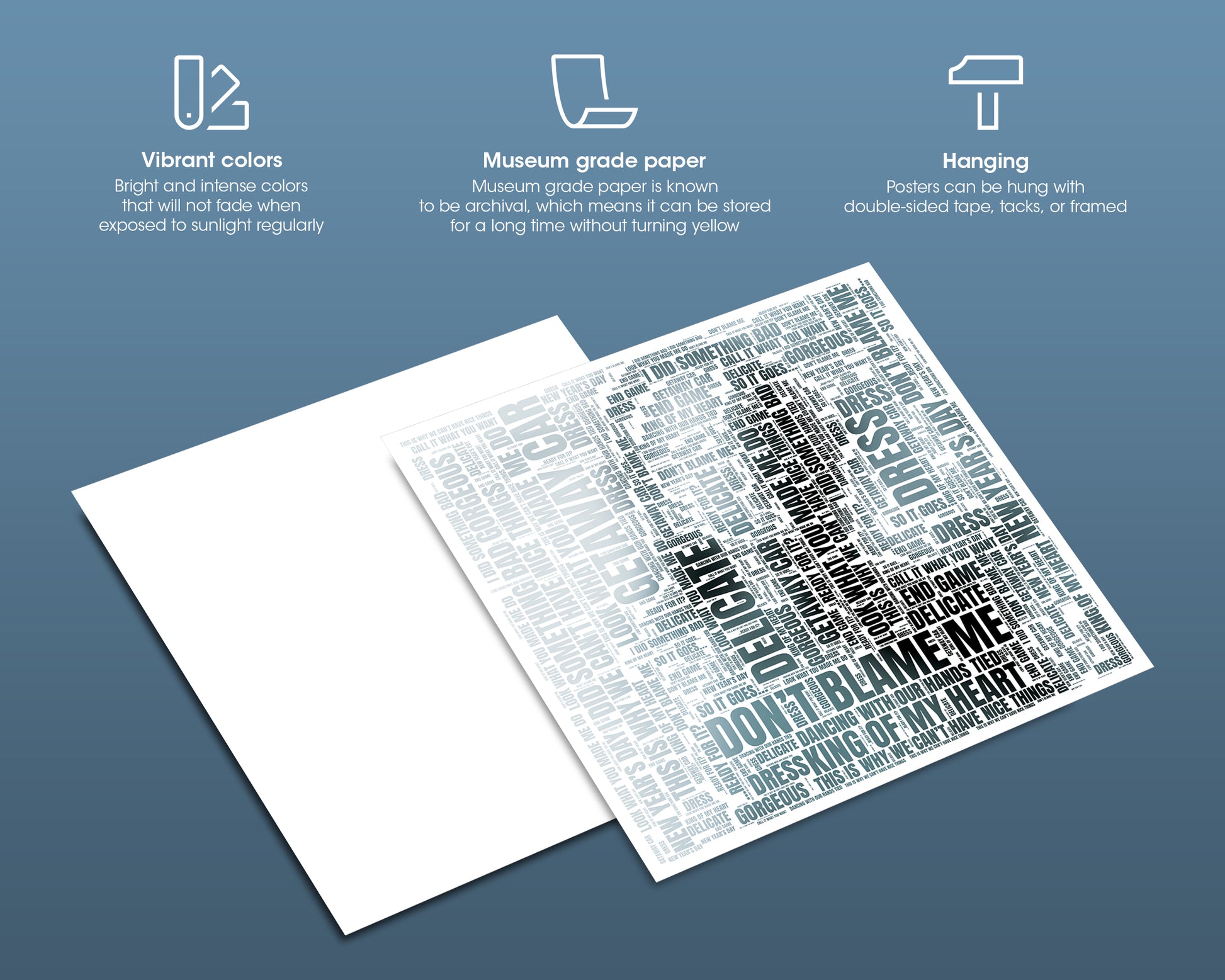 High-quality posters are made on premium matte paper. The design gets printed on white photo paper that yields brilliant prints to brighten up any room. Please note that this product is somewhat delicate, not scuff-resistant or waterproof.
