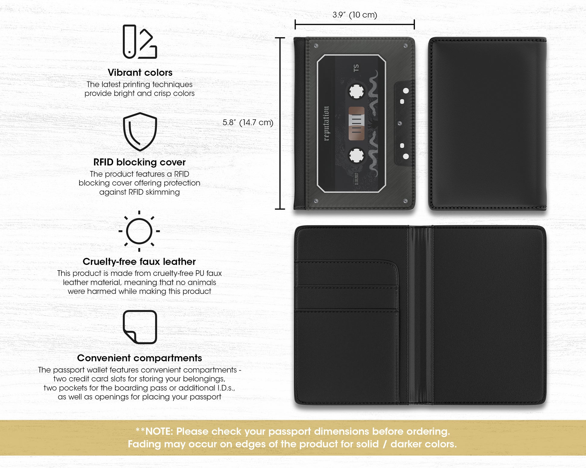 Unique passport cover, travel wallet, card holder, music merch, gift, and accessories.
