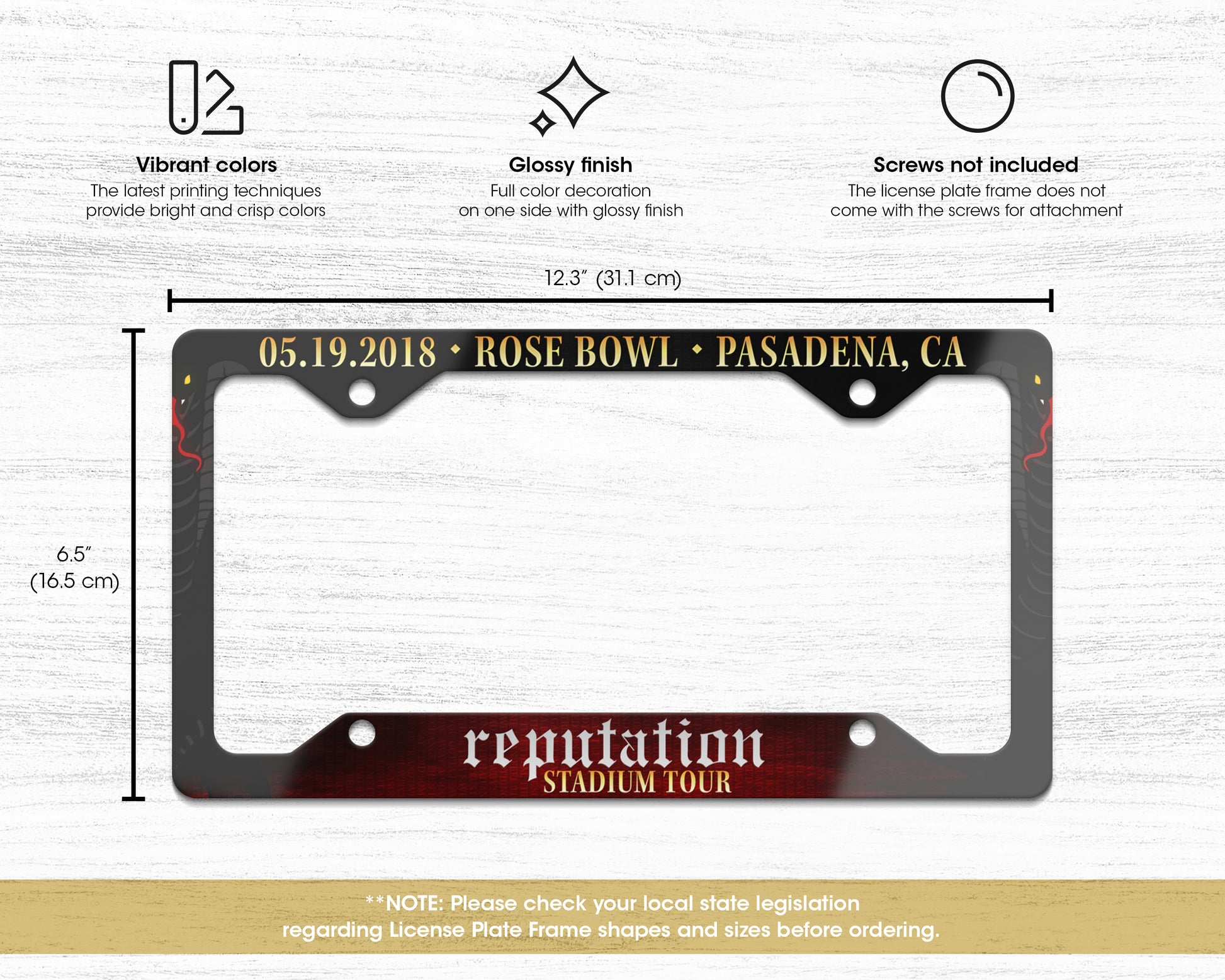 Let express yourself with this custom license plate frame which was inspired by your favorite tour. Measuring 12.3" x 6.5" (31.1cm x 16.5cm), it is the perfect size to decorate your license plate as a stylish piece. Your car should reflect who you are and what you care about. Adding a pop of color to it is an easy way to inject some personality and put a smile on your face. It also makes a lovely gift for friends and family.