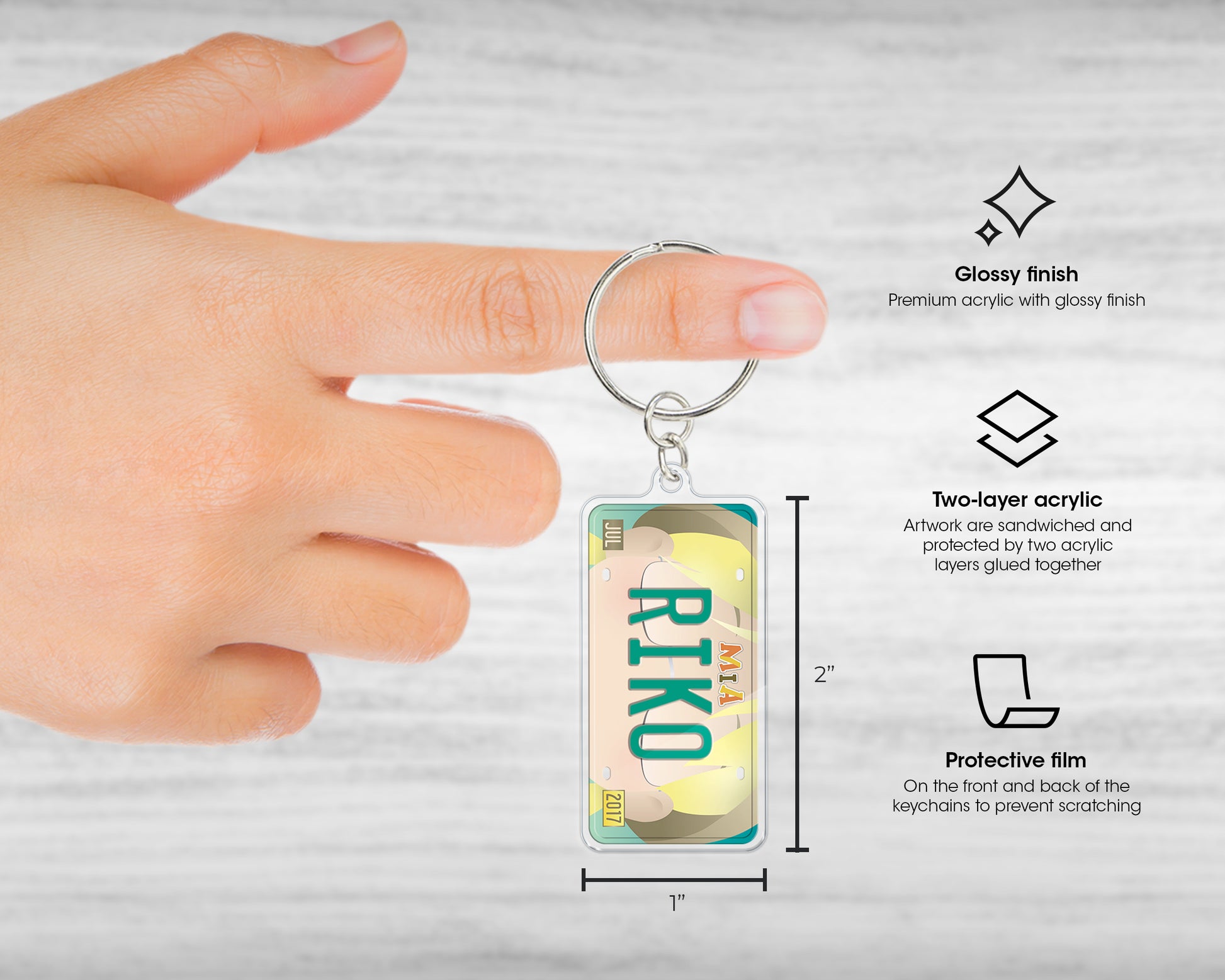 The acrylic keychains are made of high-quality acrylic material. They get laser-cut at 1" x 2". They are single-sided and get digitally printed on the second surface. Then another acrylic layer is attached to protect the artwork. They adhere to a short chain and a split metal ring. A protective film is on the front and back of the keychains to prevent scratching.