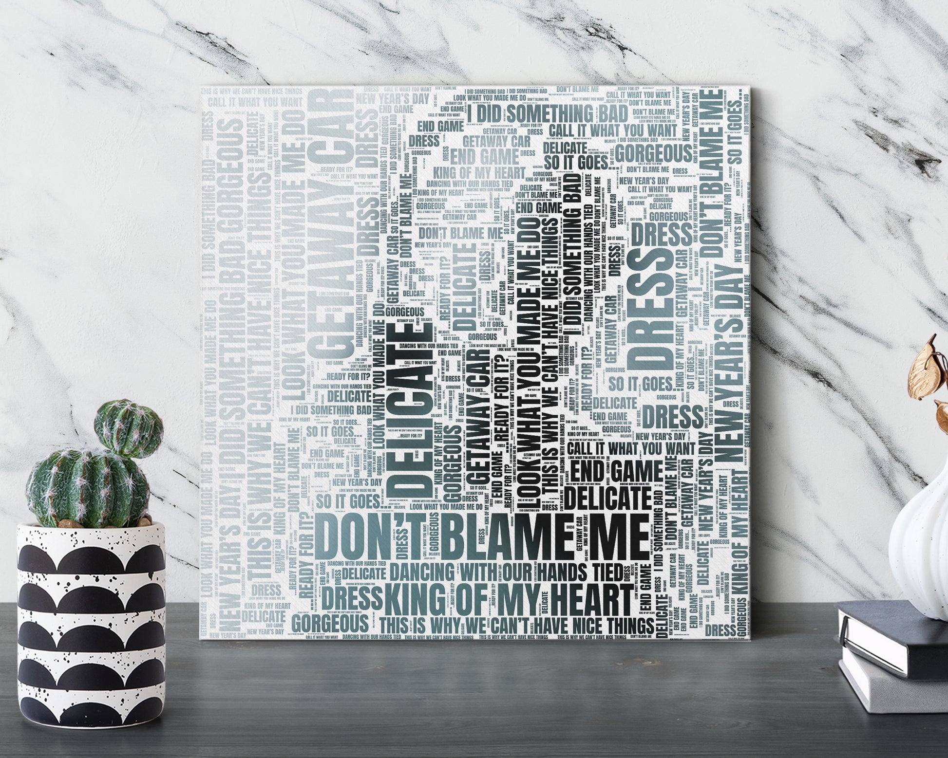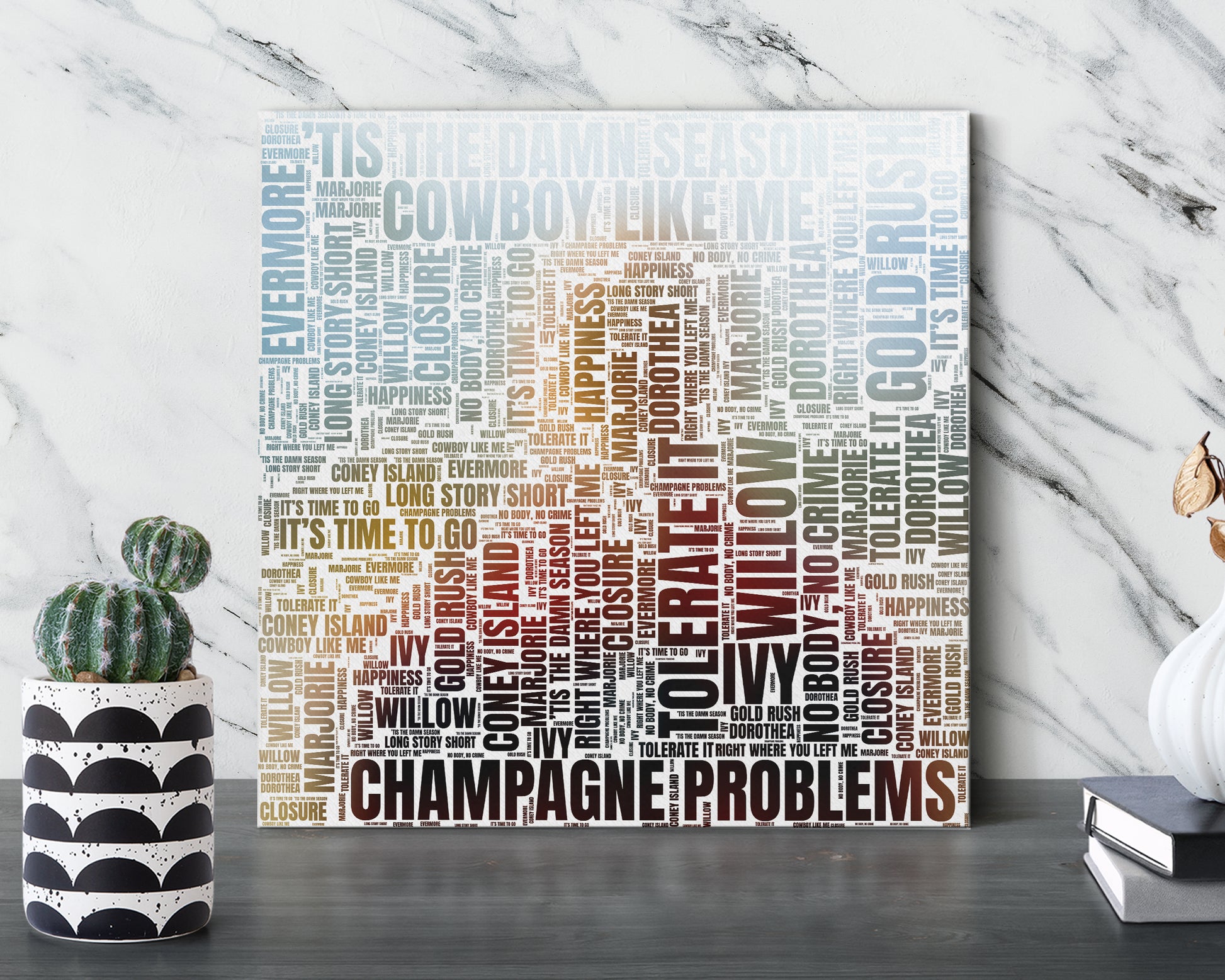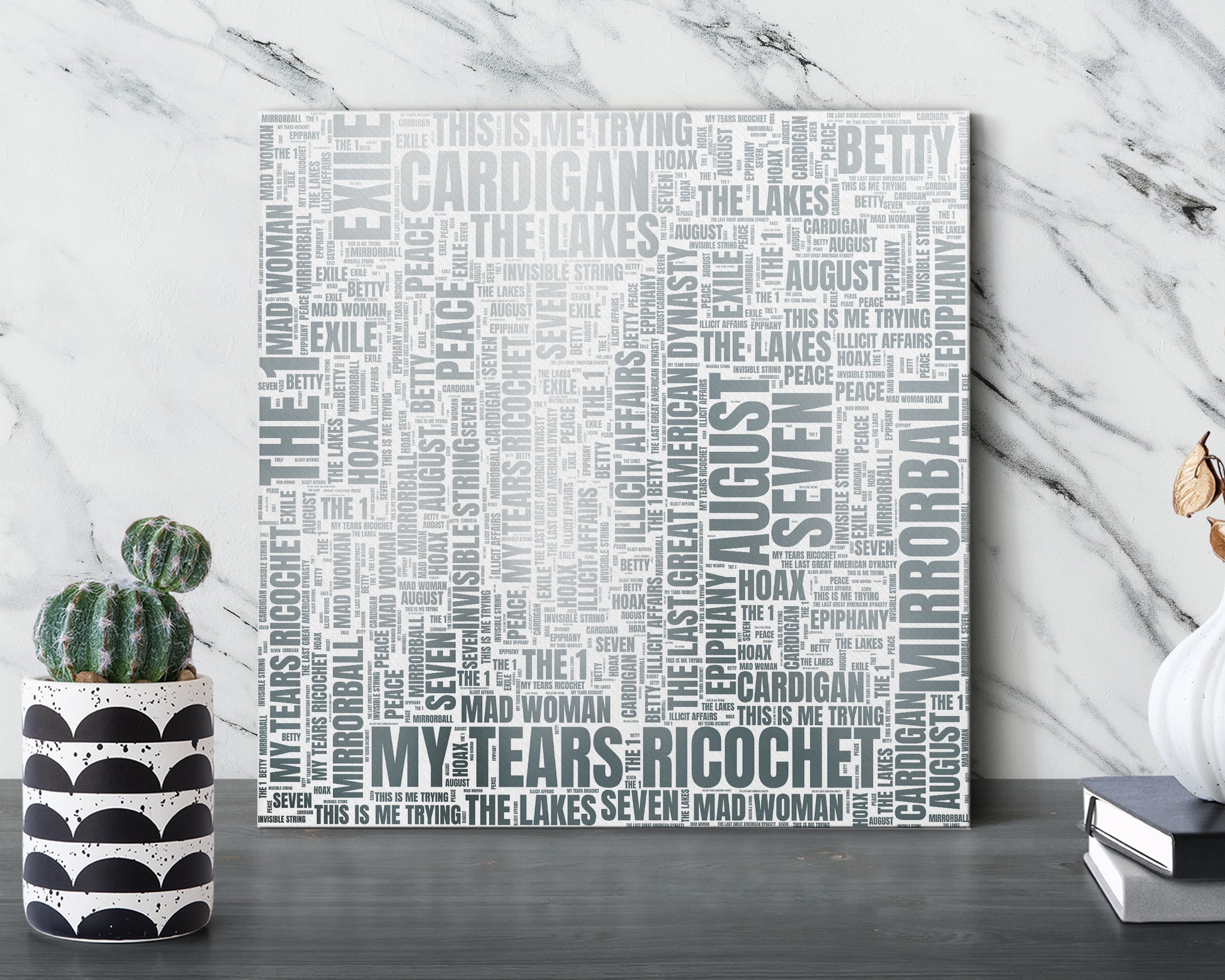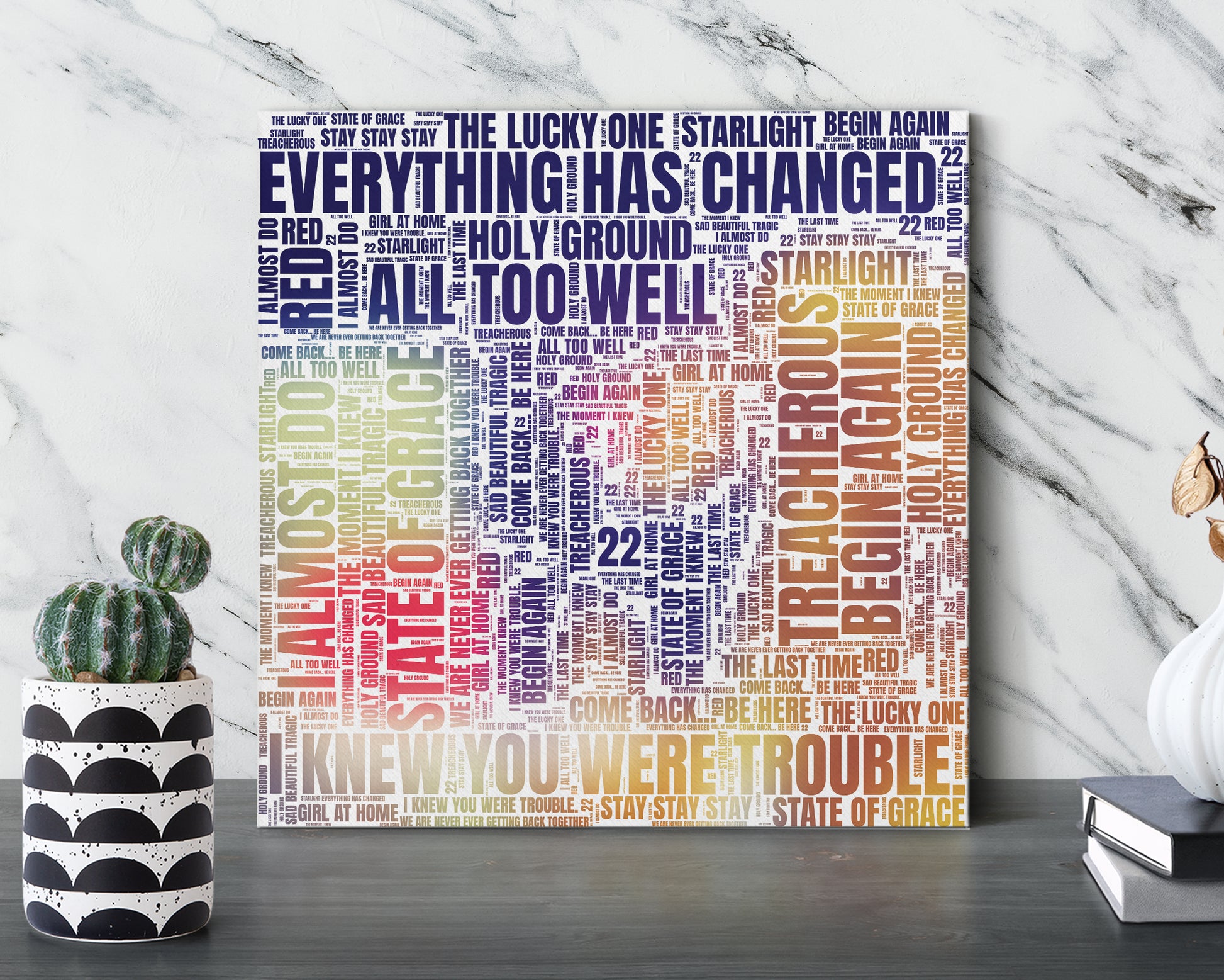 Transform your wall into a stunning work of art. These gorgeous word art designs were inspired and created from your beloved artist's discography. The minimal feel and vivid color make them stand out yet able to fit in with any style of decor. Your space should reflect who you are and what you care about. Adding a pop of color to your walls or desks is an easy way to inject some personality into any room and put a smile on your face. They also make a lovely gift for friends and family.