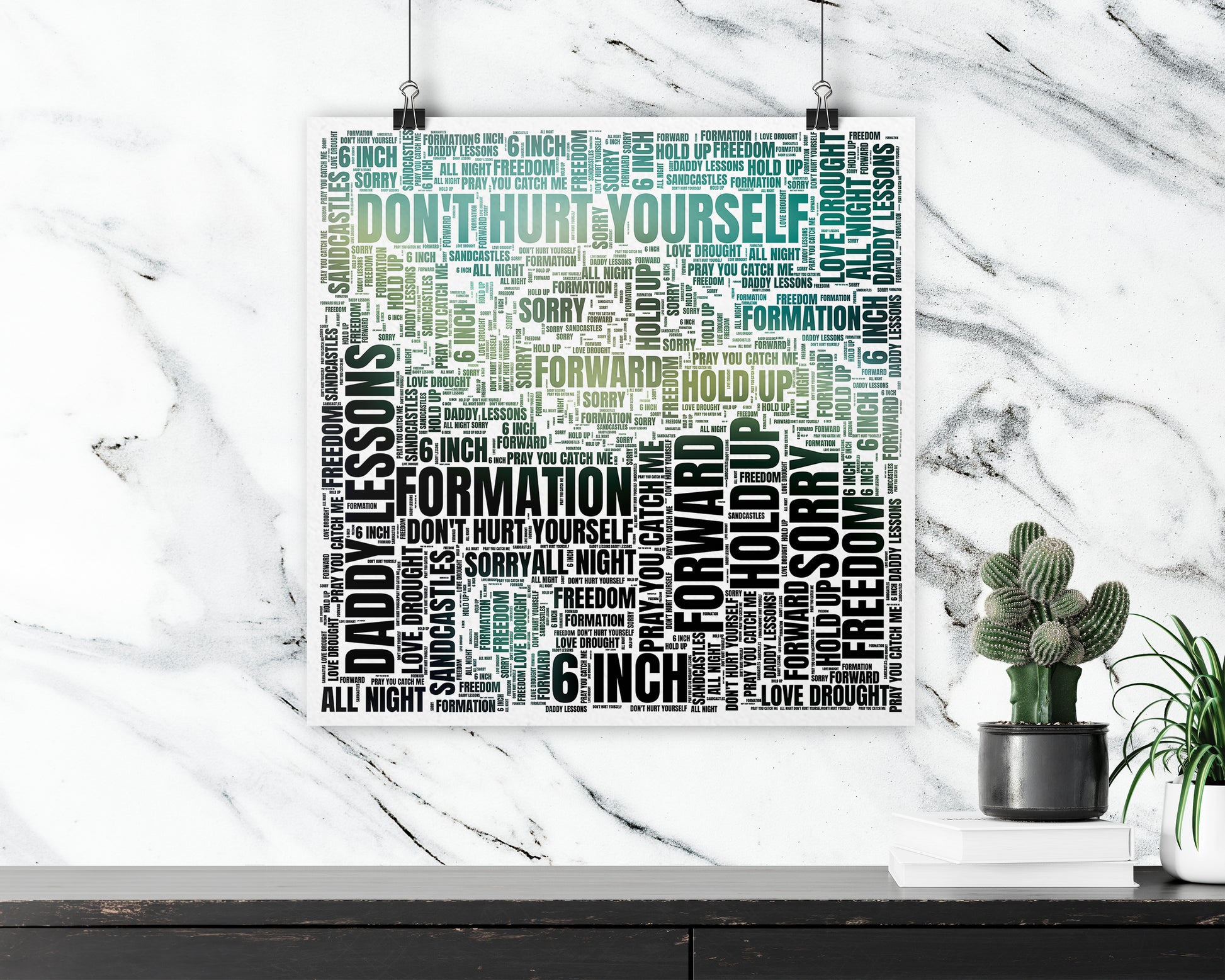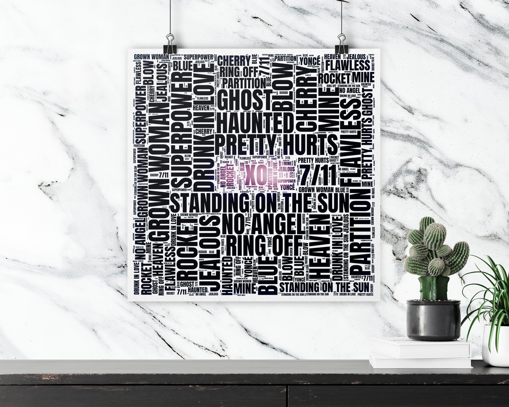 Transform your wall into a stunning work of art. These gorgeous word art designs were inspired and created from your beloved artist's discography. The minimal feel and vivid color make them stand out yet able to fit in with any style of decor. Your space should reflect who you are and what you care about. Adding a pop of color to your walls is an easy way to inject some personality into any room and put a smile on your face. They also make a lovely gift for friends and family.