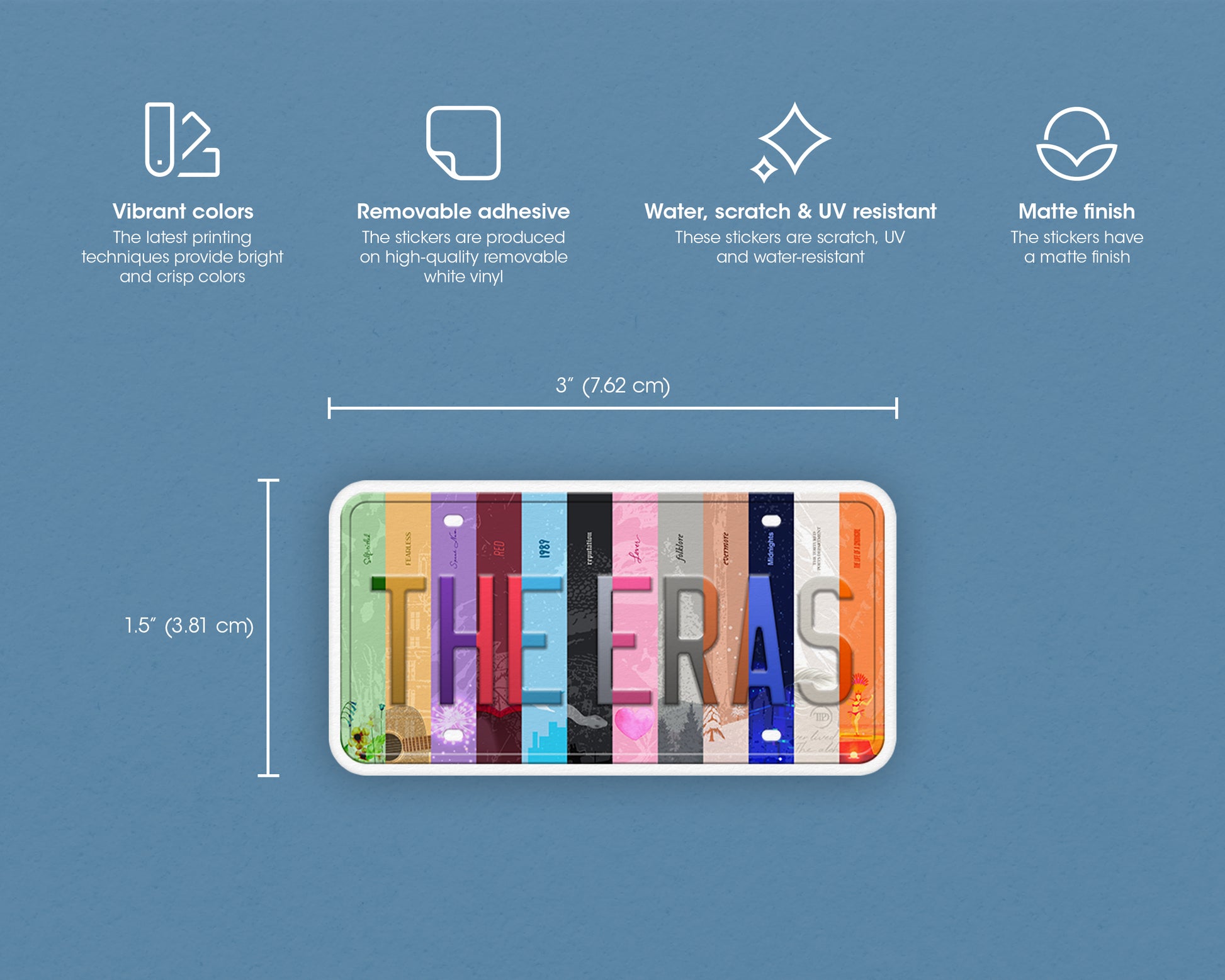 Your favorite artist's eras inspired this cute matte sticker. They’re made from a removable vinyl that makes them perfect to use on phone cases, laptops, journals, guitars, refrigerators, walls, computers, or whatever needs a dose of originality. Stickers are water-resistant so they also can be used on products that get wet occasionally such as drink bottles, bumpers, cars, helmets, skateboards, and windows. Your belongings should reflect who you are and what you care about. Adding a pop of color to them is an easy way to inject some personality and put a smile on your face. It also makes a lovely gift for friends and family.