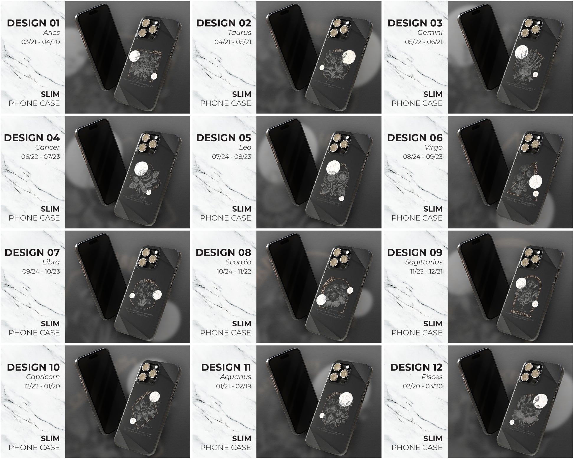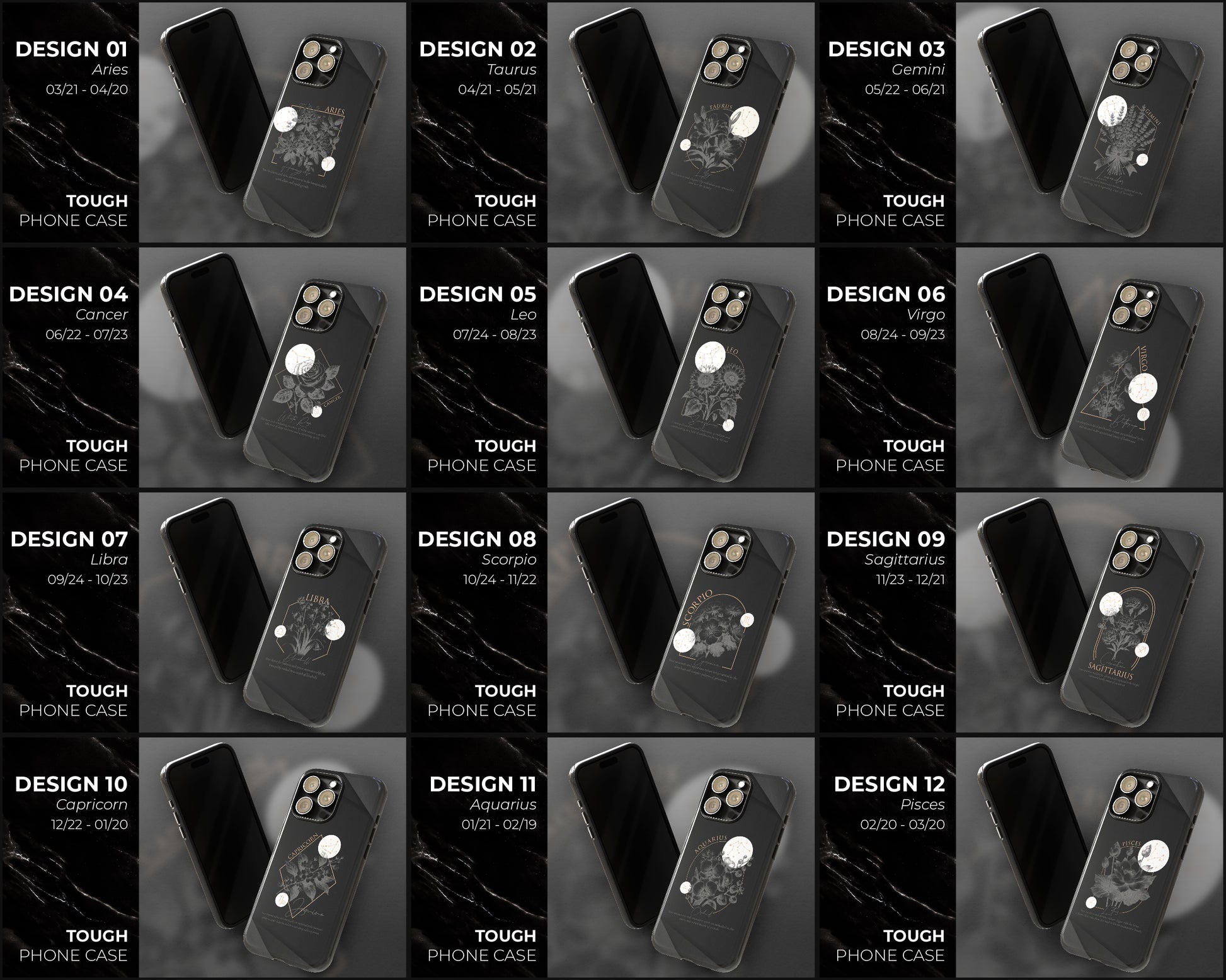 Discover a mesmerizing collection of twelve zodiac sign designs, each showcasing a beautifully drawn white birth flower specific to each sign on a deep black paper background. Accompanying each design is a brief description that captures the essential characteristics of each zodiac sign. This collection elegantly blends botanical artistry with astrological meaning, creating a visually striking and insightful experience.